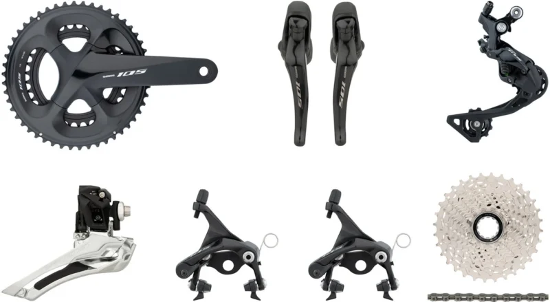 1 x Kurbelgarnitur Shimano 105 (FC-R7000)1 x Schaltwerk Shimano 105 (RD-R7000)1 x Umwerfer Shimano 105 (FD-R7000)1 Paar Schalt-/Bremsgriffe Shimano 105 STI 2-/11-fach (ST-R7000)1 Paar Felgenbremsen Shimano 105 Direktmontage (BR-R7010-F + BR-R7010-RS)1 x Kassette Shimano 105 (CS-R7000) oder CS-HG700-11 (11-34)1 x Kette Shimano 105 / SLX Quick-Link (CN-HG601-11)1 x Kurbelschraube Shimano1 x Außenhülle Shimano OT-RS900 240 mm1 x Endkappe verlängert für Schaltwerk1 x Schaltzug Shimano 1800 mm1 x Schaltzug Shimano 2100 mm2 x Bremszug2 x Bremszugaußenhülle3 x Schaltzugaußenhülle2 Paar Bremsbeläge R55C41 x Kassetten-Abschlussring Shimano Stahl1 x Kassetten-Spacer Shimano 1,85 mm (nur bei 11-34)1 x Kettenschloss Shimano SM-CN900-11 Quick-Link