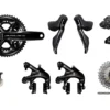 Diese Dura-Ace Di2 R9250 Road Komplettgruppe von Shimano besteht aus einer 2×12-fach-Leistungsmesskurbel mit 40-54-Zähne-Abstufung, einem Felgenbremsenset und einem elektronischen Schaltwerk sowie Umwerfer. Natürlich sind auch ein Akku, eine Quick-Link-Kette und eine Kassette mit 11-30 oder 11-34 Zähnen mit dabei.