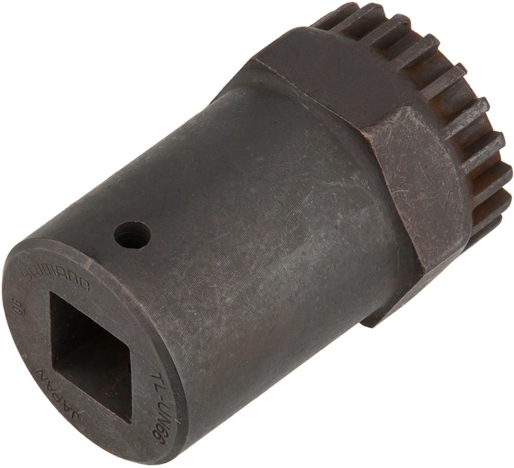 Das Shimano TL-UN66 ist ein Werkzeug zur Montage und Demontage von Cartridge-Innenlagern mit 20-Zähne-Verzahnung wie bei Octalink und Vierkant. Es funktioniert hingegen nicht mit Hollowtech II Innenlagern. Verwende TL-UN66 mit 32 mm Maulschlüssel oder 1/2″ Vierkant-Ratsche.