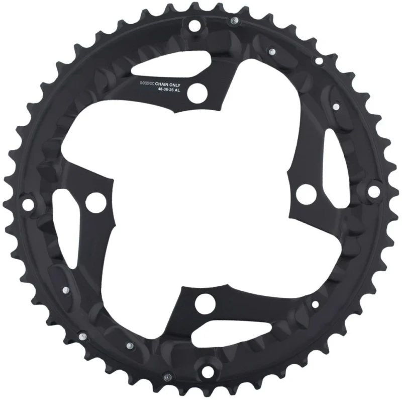 Spezifikationen:Einsatzbereich:Touring & TrekkingBefestigung:104 mm Lochkreis, 4-ArmZähne:44 Z, 48 ZSchaltstufen:3×10-fachTechnische Daten:Kombinationsmöglichkeiten:24-32-44 Z KSR, 26-36-48 Z KSRMaterial:AluminiumKompatibilität:FC-T521auch verwendbar für FC-T551, FC-T611Features:Ausführung für KettenschutzringAusführungen:44 Zähne: