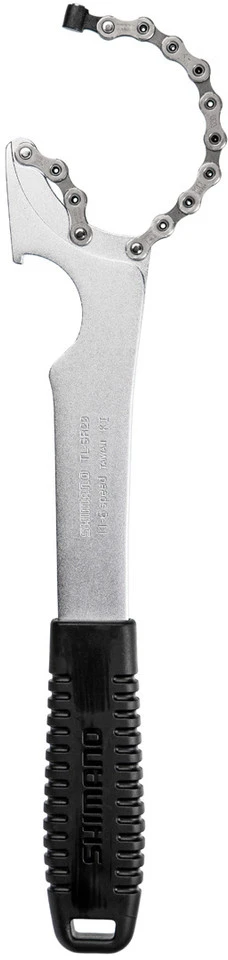 Die Shimano Kettenpeitsche TL-SR23 ist ein Ritzelgegenhalter mit ergonomischem Griff. Sie kann für 6- bis 11-fach, jedoch nicht für 12-fach Kassetten verwendet werden, um den Lockring mit einem entsprechenden Werkzeug zu lösen. Ihre gebogene Form gewährleistet optimalen Halt an den Ritzeln.