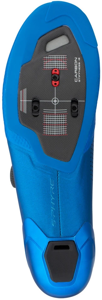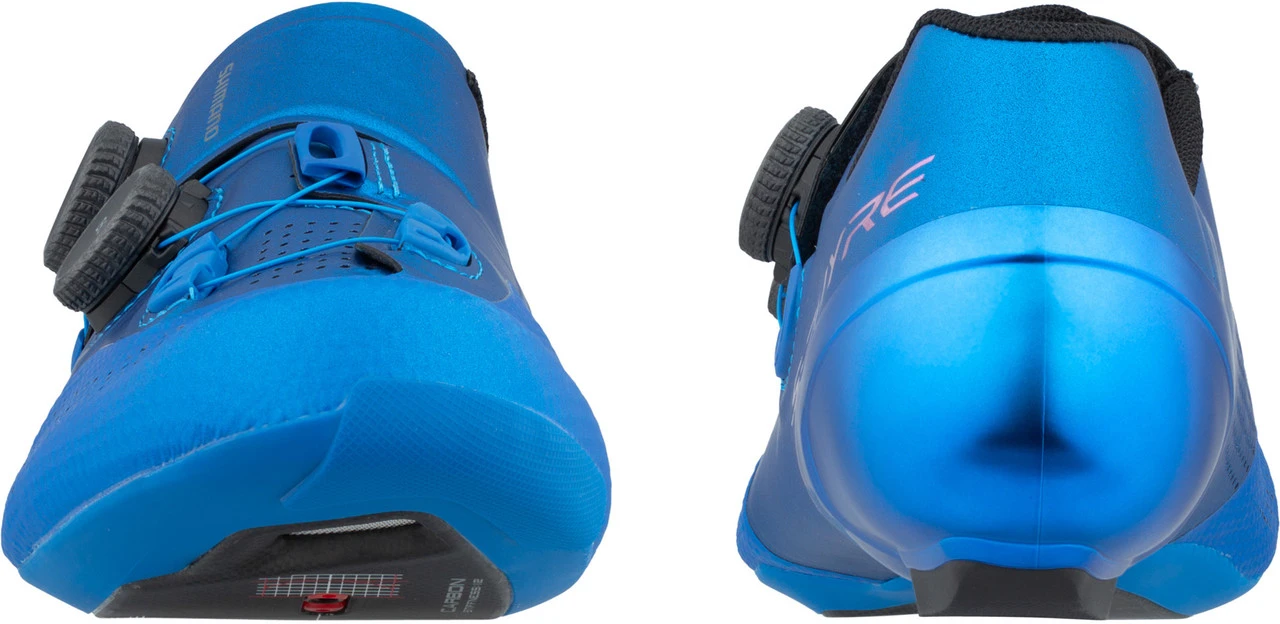 Die Shimano S-Phyre SH-RC902 High-Performance-Schuhe für wettkampforientierte Rennradsportler gibt es auch in einer Ausführung mit breiterem Leisten, kurz RC9E genannt. Wie das Standardmodell zeichnen sie sich durch zwei hochpräzise einstellbare BOA® Li2-Drehverschlüsse und eine hervorragende Passform aus. Ihre Oberschuh-Konstruktion umfasst den Fuß nicht nur optimal, sie wurde auch mit funktionsspezifischen Zonen ausgestattet, um Flexibilität und Festigkeit in ein optimales Verhältnis zu setzen. Im Vorderfußbereich kommt eine Powerzone-Drahtführung für verbesserten Halt zum Einsatz; hinten sorgt eine spezielle Fersenkappe für Verdrehschutz bei Sprints. Die ultrasteifen Zwischen- und Außensohlen aus Carbon stehen für hocheffiziente Kraftübertragung, wobei die optimierte Shimano Dynalast-Leistentechnologie einer vorzeitigen Ermüdung vorbeugt.