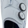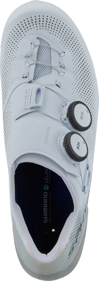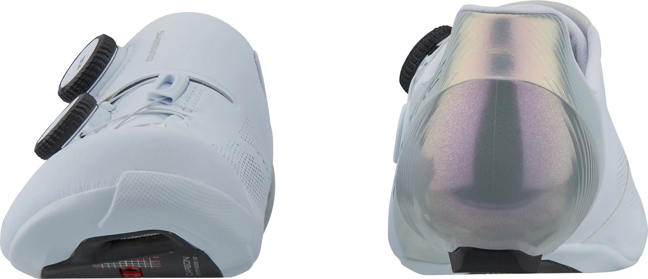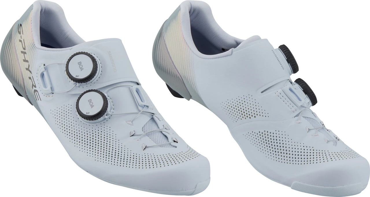 Die S-Phyre SH-RC903 von Shimano, kurz RC9 genannt, sind Spitzenklasse-Rennradschuhe für den Wettkampfeinsatz, die eine frauenspezifische Passform haben. Dank des verschlankten Profils konnten gegenüber dem Vorgängermodell noch einmal über 15 Gramm pro Paar eingespart werden. Der Oberschuh besteht aus leichtem, atmungsaktivem Kunstleder und wurde so konstruiert, dass er den Fuß perfekt umschließt, was für einen hervorragenden Sitz und dauerhaften Komfort sorgt. Die Zwischensohle sowie die hochsteife Außensohle aus Carbon sind ebenfalls perfekt in das Chassis integriert. Zwei flache BOA Li2-Drehverschlüsse lassen eine schnelle und präzise Feineinstellung zu. Dabei weisen die Schnürdrähte ein spezielles Kreuzmuster auf, welches den Vorderfuß angenehm fixiert. Hinten kommt eine hochwertige Fersenkappe mit Verdrehschutz zum Einsatz, um den Fuß auch bei harten Antritten optimal zu positionieren. Natürlich verfügt auch dieses Modell über die Shimano Dynalast-Schuhleistentechnologie für mehr Pedaliereffizienz und längere Leistungsfähigkeit.