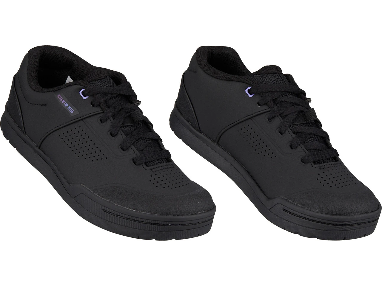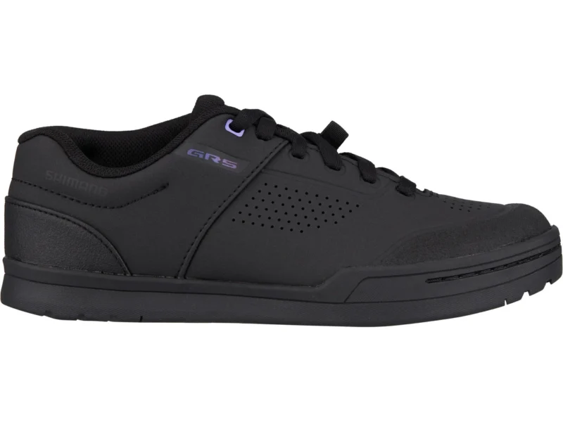 Der SH-GR501, kurz GR5 genannt, ist ein frauenspezifischer Plattformpedal-Schuh von Shimano, welcher Gravity-Mountainbikerinnen mit guter Passform und Schutzfunktion sowie mit Komfort und Style begeistert. Er besteht aus robustem Kunstleder-Obermaterial mit atmungsaktiven Mesh-Einsätzen und verfügt über eine griffige Gummisohle, die auf Pedal und Boden Halt bietet. Zehen- und Knöchelbereich wurden extra verstärkt. Außerdem tragen sich die Schuhe dank des erweiterten Volumens im Fußballenbereich auch auf stundenlangen Ausfahrten sehr angenehm.