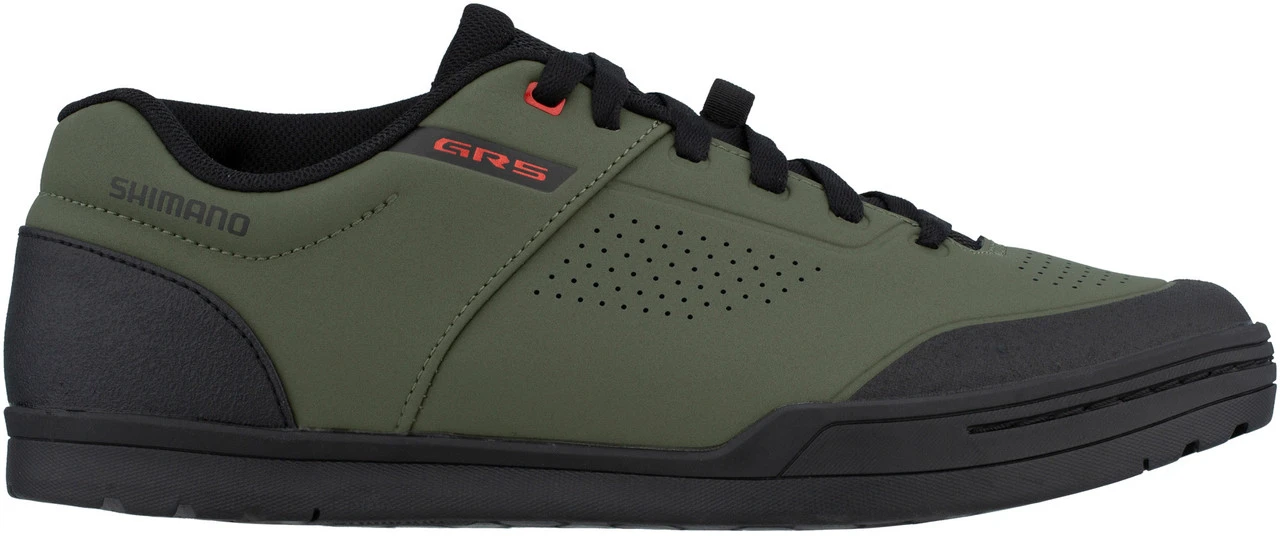 Die SH-GR501, kurz GR5 genannt, sind Plattformpedal-Schuhe von Shimano, welche Gravity-Mountainbiker mit guter Passform und Schutzfunktion sowie mit Komfort und Style begeistern. Sie bestehen aus robustem Kunstleder-Obermaterial mit atmungsaktiven Mesh-Einsätzen und verfügen über griffige Gummisohlen, die auf Pedal und Boden Halt bieten. Zehen- und Knöchelbereich wurden extra verstärkt. Außerdem tragen sich die Schuhe dank ihrer ergonomischen Leisten auch auf stundenlangen Ausfahrten sehr angenehm.