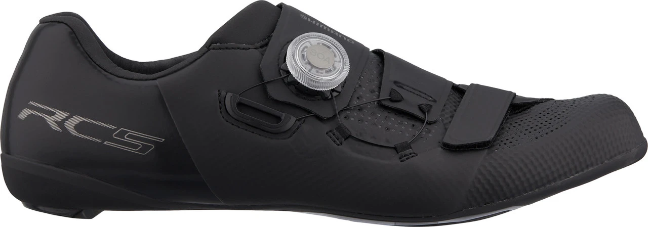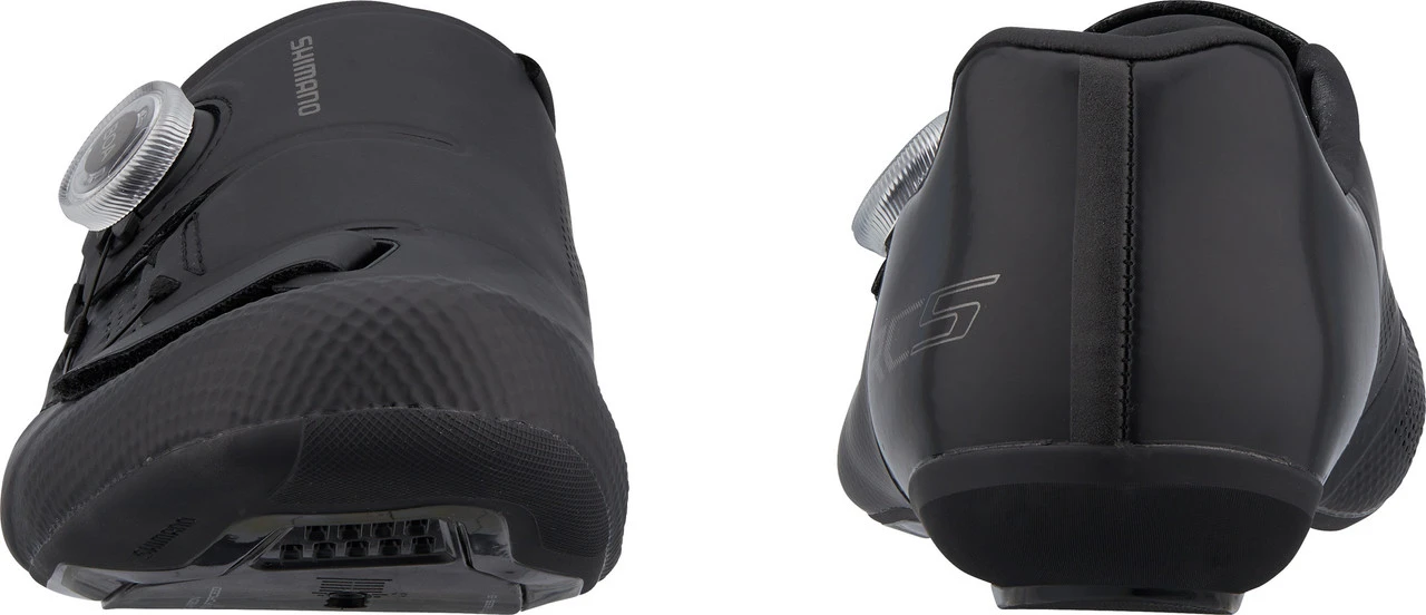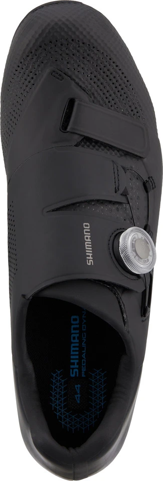Die SH-RC502 Roadbike-Schuhe von Shimano, kurz RC5 genannt, haben einen schnell einstellbaren BOA-L6-Drehverschluss und eine steife, carbonfaserverstärkte Nylonsohle. Sie zeichnen sich durch ihr geringes Gewicht und die bequeme Passform aus, was beides durch den wenig überlappenden Oberschuh aus Kunstleder, Netzgewebe und TPU ermöglicht wird. Auch die integrierte nahtlose Zwischensohle leistet ihren Beitrag zum angenehmen Tragegefühl und erhöht zudem die Stabilität. Zugunsten der Pedaliereffizienz weisen die RC5 darüber hinaus eine flache Mittelsohle auf. Die Shimano Dynalast-Technologie der Schuhleisten fördert die Pedaliereffizienz und wirkt einer vorzeitigen Ermüdung entgegen.