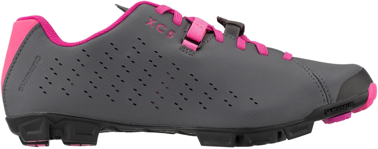 Die Shimano SH-XC5 Women Schuhe (SH-XC500W) bieten Frauen den nötigen Komfort, um bei Cross-Country-, Cyclocross- oder Fahrten auf Schotterstraßen noch mehr Spaß zu haben. Das Powerstrap-Schnürsystem gibt dem Fuß sicheren Halt, während die carbonfaserverstärkte Mittelsohle für mehr Steifigkeit sorgt. Außen kommt eine traktionsstarke Michelin Sohle zum Einsatz. Das perforierte Obermaterial des Schuhs garantiert optimale Belüftung.